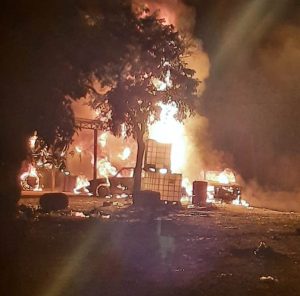 El hecho ocurrió en las primeras horas de la noche de este miércoles en “Paso Surubí” ubicado en el B° Porteño Sur de Clorinda (frontera con Paraguay) donde efectivos de la policía, quienes fueron alertados del hecho, corroboraron un incendio de grandes proporciones dentro de un predio que afectó a dos vehículos automotores, un tanque cisterna de 3.000 litros y varios contenedores 200 litros, presumiblemente con combustible, envueltos completamente con las llamas.