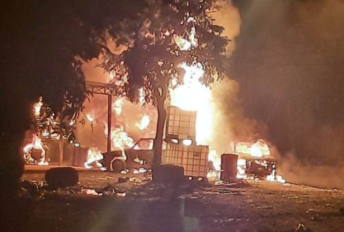 El hecho ocurrió en las primeras horas de la noche de este miércoles en “Paso Surubí” ubicado en el B° Porteño Sur de Clorinda (frontera con Paraguay) donde efectivos de la policía, quienes fueron alertados del hecho, corroboraron un incendio de grandes proporciones dentro de un predio que afectó a dos vehículos automotores, un tanque cisterna de 3.000 litros y varios contenedores 200 litros, presumiblemente con combustible, envueltos completamente con las llamas.