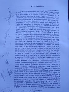 Estuvieron presentes el Intendente del Municipio Yuyi Murdoch junto a sus funcionarios, representantes de la Defensoria del Pueblo, el delegado local del IPS Provincial, el capacitador de la Subsecretaria de Economía Social y el representante de Registro Civil de Laguna Naineck, quienes mantuvieron conversaciones con los portavoces de la manifestación que tuvo lugar casi un mes.