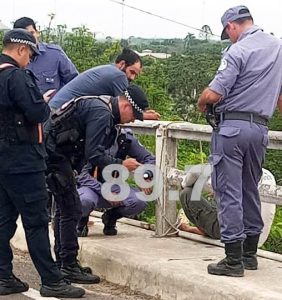 Inmediatamente acudieron al puente Interprovincial, donde también llegaron efectivos de la Policía Caminera del Chaco, donde observaron que un hombre se encontraba sujetado a una cuerda por la baranda del puente, con intenciones de lanzarse al río Bermejo.