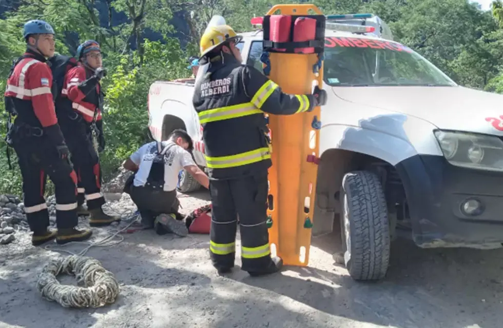 Los equipos de rescate, entre los que estaban los Bomberos Voluntarios de Alberdi, debieron utilizar cuerdas para descender hasta el lugar en el que fueron encontradas las personas accidentadas.