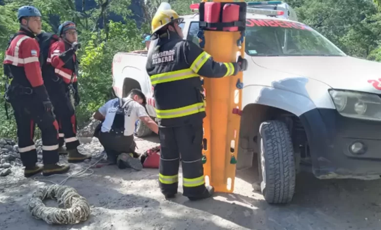Los equipos de rescate, entre los que estaban los Bomberos Voluntarios de Alberdi, debieron utilizar cuerdas para descender hasta el lugar en el que fueron encontradas las personas accidentadas.