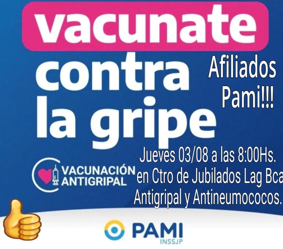 En Laguna Blanca los afiliados podrán vacunarse el jueves 03 de agosto a partir de la 08:00 hs en el Centro de Jubilados Lag. Blc.